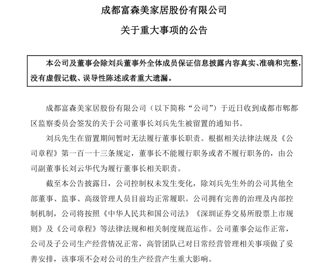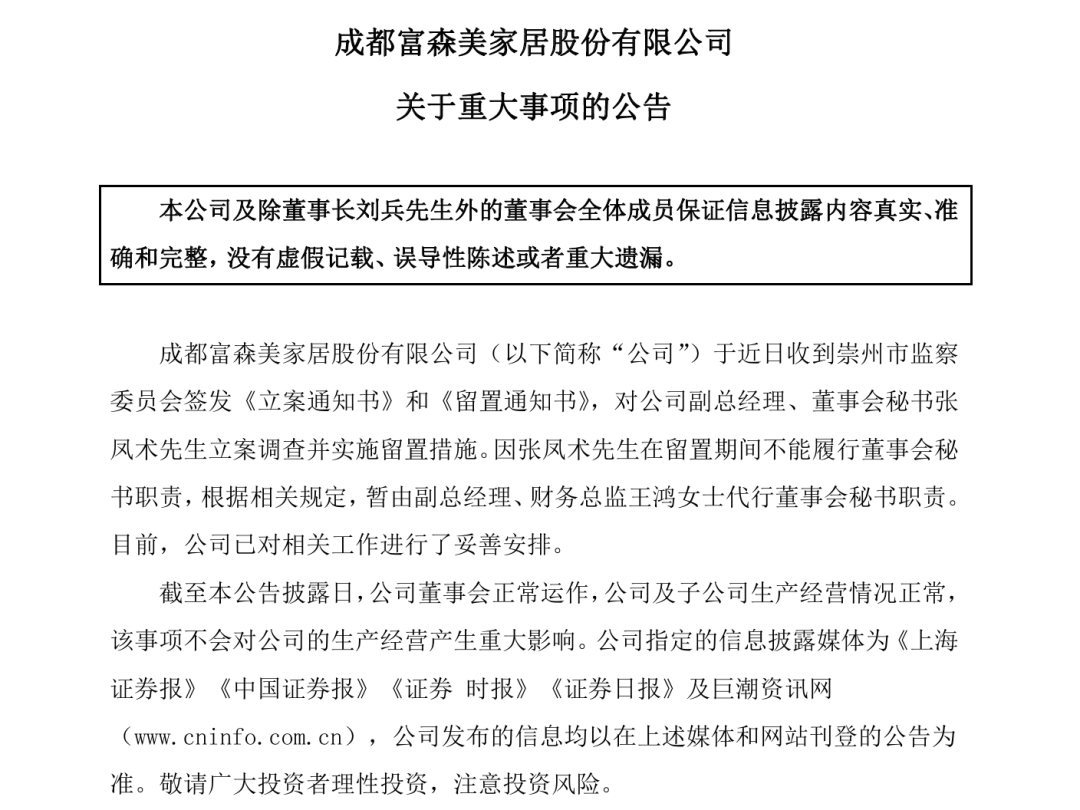 一卖场巨头年薪112万副总被留置近日,成都富森美家居股份有限公司(以下简称“富森美”)披露公司副总经理、董事会秘书张凤术被立案调查并留置,目前董事会秘书职责暂由副总经理、财务总监王鸿代行。这是富森美四个月内第二名高管被留置,今年7月,富森美董事长刘兵也被留置,该公司指尚未知悉相关事项的进展及结论。 富森美副总、董秘张凤术被立案调查 11月26日,富森美发布《关于重大事项的公告》,表示公司于近日收到崇州市监察委员会签发《立案通知书》和《留置通知书》,对公司副总经理、董事会秘书张凤术立案调查并实施留置措施。 ![]() 公告透露,因张凤术在留置期间不能履行董事会秘书职责,根据相关规定,暂由副总经理、财务总监王鸿代行董事会秘书职责。 目前,公司已对相关工作进行了妥善安排。截至本公告披露日,公司董事会正常运作,公司及子公司生产经营情况正常,该事项不会对公司的生产经营产生重大影响。富森美同时呼吁投资者理性投资,注意投资风险。 公开资料显示,张凤术生于1968年,拥有EMBA学位,曾先后在农业银行内蒙古阿鲁科尔沁旗支行、蛇口泰山(集团)股份有限公司、通威股份有限公司、四川永丰纸业股份有限公司从事财务和证券工作,2009年3月加入富森美,2009年11月起任公司董事会秘书,2009年12月起任公司副总经理、 董事会秘书。 据富森美2024年年度报告,张凤术2024年从公司获得的税前报酬总额为112万元。 四个月内两高管被留置 富森美本次高管留置事件是四个月内第二起。今年7月24日,富森美透露公司收到成都市郫都区监察委员会签发的关于公司董事长刘兵被留置的通知书,刘兵在留置期间暂时无法履行董事长职责,由公司副董事长刘云华代为履行董事长相关职责。 ![]() 有媒体记者就四个月内两高管被留置事件,咨询富森美是否考虑适时选举新任董事长及董事会秘书,富森美方面表示公司目前暂无相关考虑,强调财务总监代行董事会秘书职责期间,公司会严格按照相应法律法规要求履行信披义务,确保信披及时与准确性,又指公司尚未知悉董事长被留置事项的进展及结论,且尚不清楚两名高管被留置是否因同一案件。 公开资料显示,刘兵为富森美实控人、董事长,直接持有上市公司43.7%的股份,与一致行动人刘云华(公司董事、副董事长,持股比例27.70%)、刘义(公司董事、总经理,持股比例8.71%)合计持有上市公司80.11%的股份,对公司拥有绝对控制权。 富森美营业收入持续下滑 富森美成立于2000年12月,2016年11月在深圳证券交易所挂牌上市,自营商城面积规模超125万平方米,是西南地区最大的家居卖场企业之一。 近数期,富森美业绩持续下滑。2024年全年营收14.30亿元,同比减少6.18%。进入2025年,第一季度营收减少13.19%,上半年减少11.55%。据最新的第三季度报告,富森美2025年1-9月营业收入9.24亿元,同比减少14.35%;归属于上市公司股东的净利润4.77亿元,同比减少12.60%;报告期内,富森美基本每股收益为0.64元,加权平均净资产收益率为8.27%。 ![]() 面对业绩下滑等经营压力,富森美积极寻找新增长点,例如近期就携手美的、海尔、格力等头部品牌,力图将实体店塑造成融合家电、家居、艺术与社交的复合功能体,实现从“卖产品”到“卖生活方式”的升级。