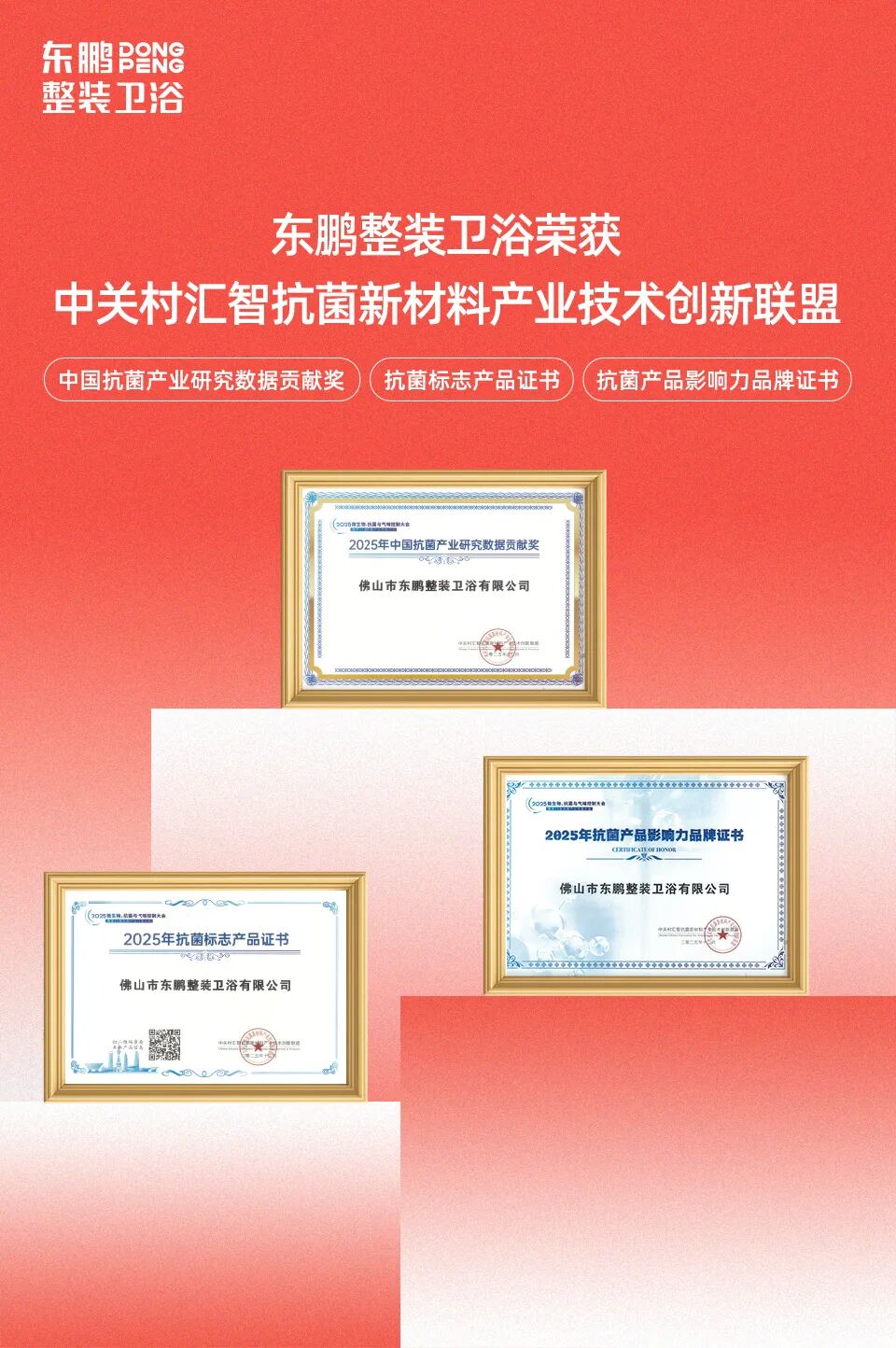 东鹏整装卫浴荣获三项抗菌领域大奖,以科技实力引领健康卫浴新未来
