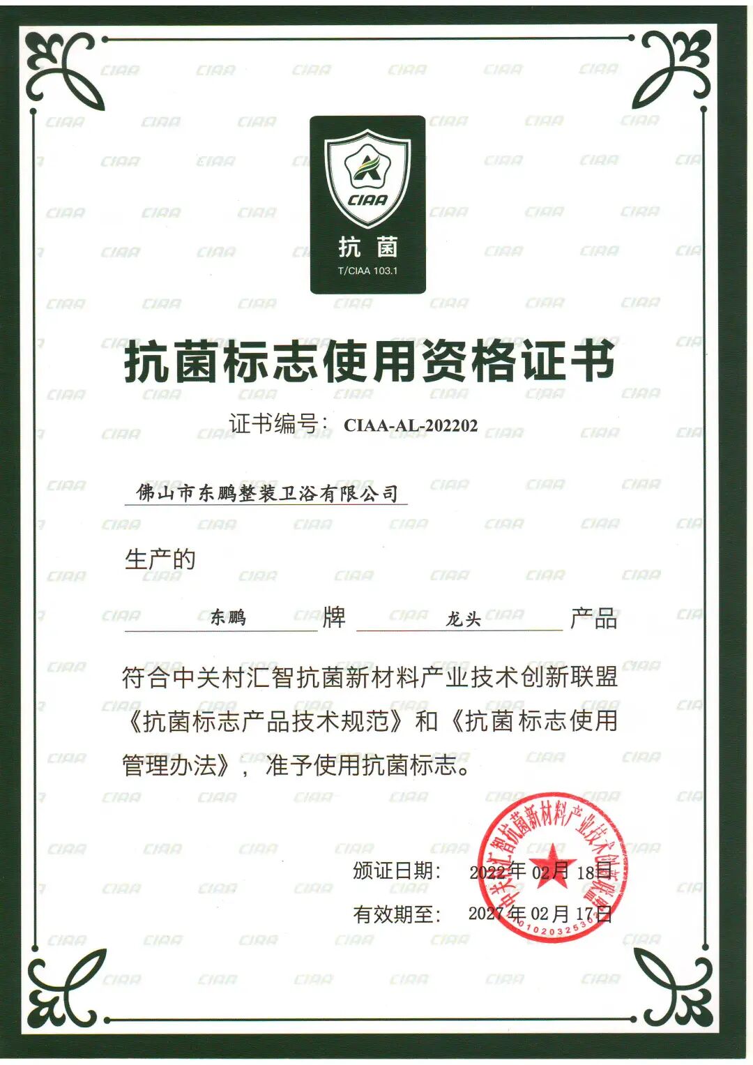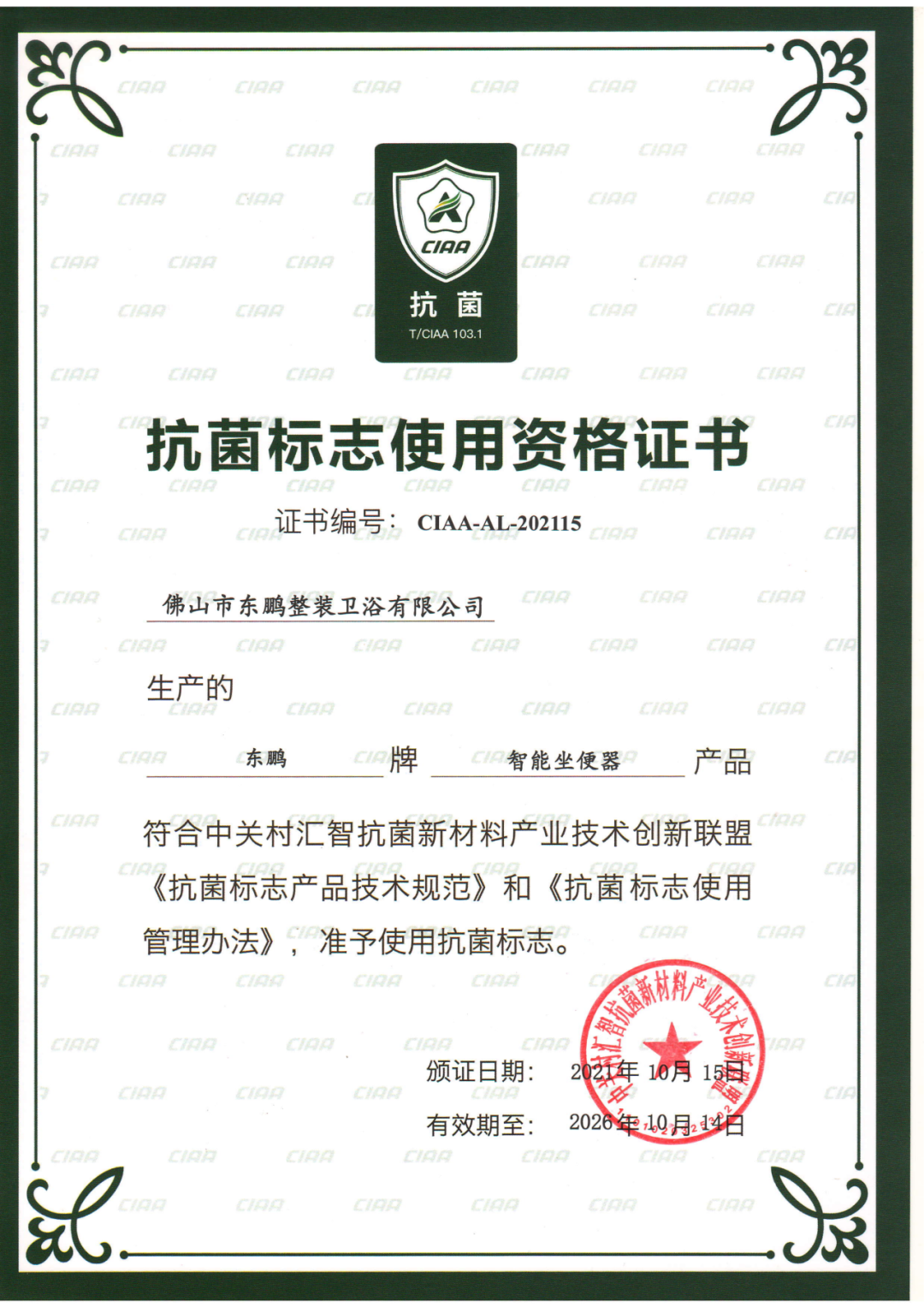 此外,本次大会现场发布了2025年度抗菌标志产品,对获得抗菌标志使用授权的品牌进行公布。多年来,东鹏整装卫浴持续获得行业权威认证。从2021年起,东鹏的多款产品连续获得CIAA抗菌标志产品称号。现在,东鹏整装卫浴多品类产品获得CIAA抗菌标志认证,这意味着卫浴空间每一个细节,从普通坐便器到智能马桶,从龙头五金到陶瓷盆,再到卫浴核心淋浴房,东鹏整装卫浴的多样产品线均达到国家严苛的抗菌标准。